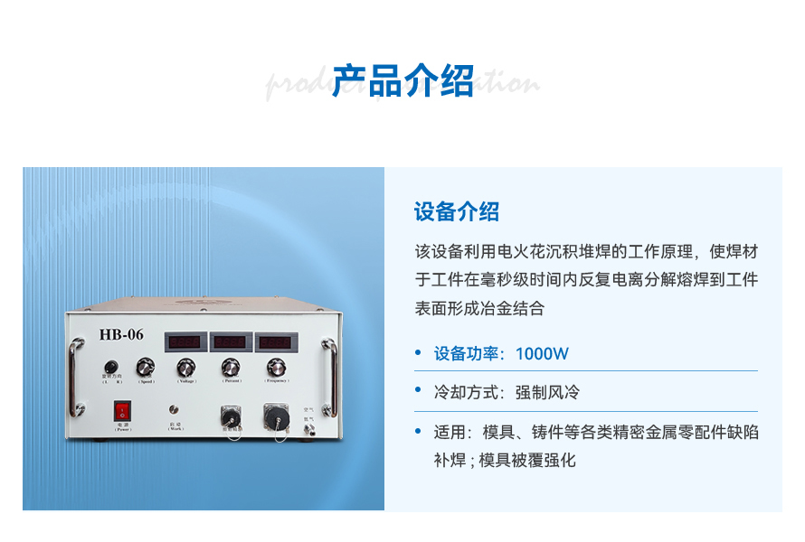 HB-06 型 电火花堆焊修复机 1. 设备特点:无退火、不变形、溶接强度高修复精度高。操作简单任何人都可以操作,堆焊高度高,修复速度快,无色差、不咬边,便携式可现场操作等优点。 2. 适用材质及范围:设备输出阻抗小,适用于 铁件、钢件、铜件、铝合金、镁